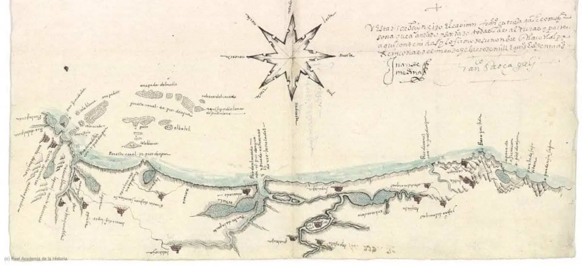 It is a hand-drawn nautical chart from February 1580, done with great exactness for the standards of the time. It shows in great detail the coast, the estuaries, bays, capes, lagoons and rivers, and in some areas indicates the depth of the water. Both the chart and the text of the Relación are kept in the Royal Academy of History in Madrid. According to the text of the Relación, in the local tongue náhuatl-Tlacotalpa means divided land, which refers to the fact that the village was founded in the Pre-Hispanic era on an island in the river Papaloapan, as is represented on the map.