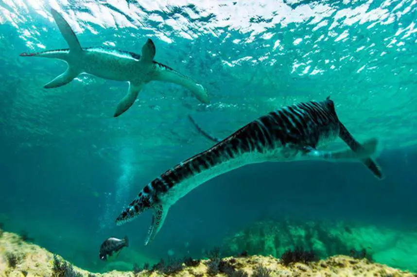 These shallow waters were home to a group of marine reptiles known as plesiosaurs, with small heads, long necks, short tails and wide, cylindrical bodies with large fins. Although they co-existed with the dinosaurs and became extinct at the same time, these reptiles, which may have exceeded 15 metres in length, were not closely related to the dinosaurs.
