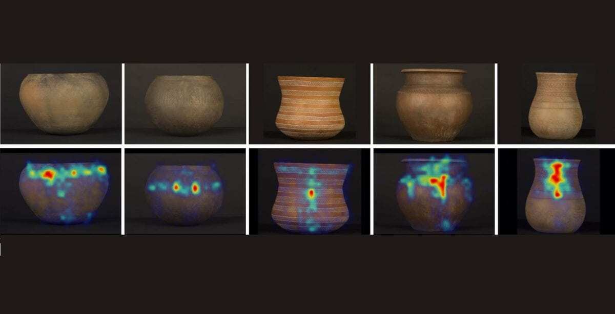 Header Image – Main ceramics analyzed in the experiments and heatmap of the visual fixations in each one of them. The images are organized, from left to right, in chronological order from oldest to most recent. Following time, the fixations direction changes from horizontal to vertical. Credit : CSIC