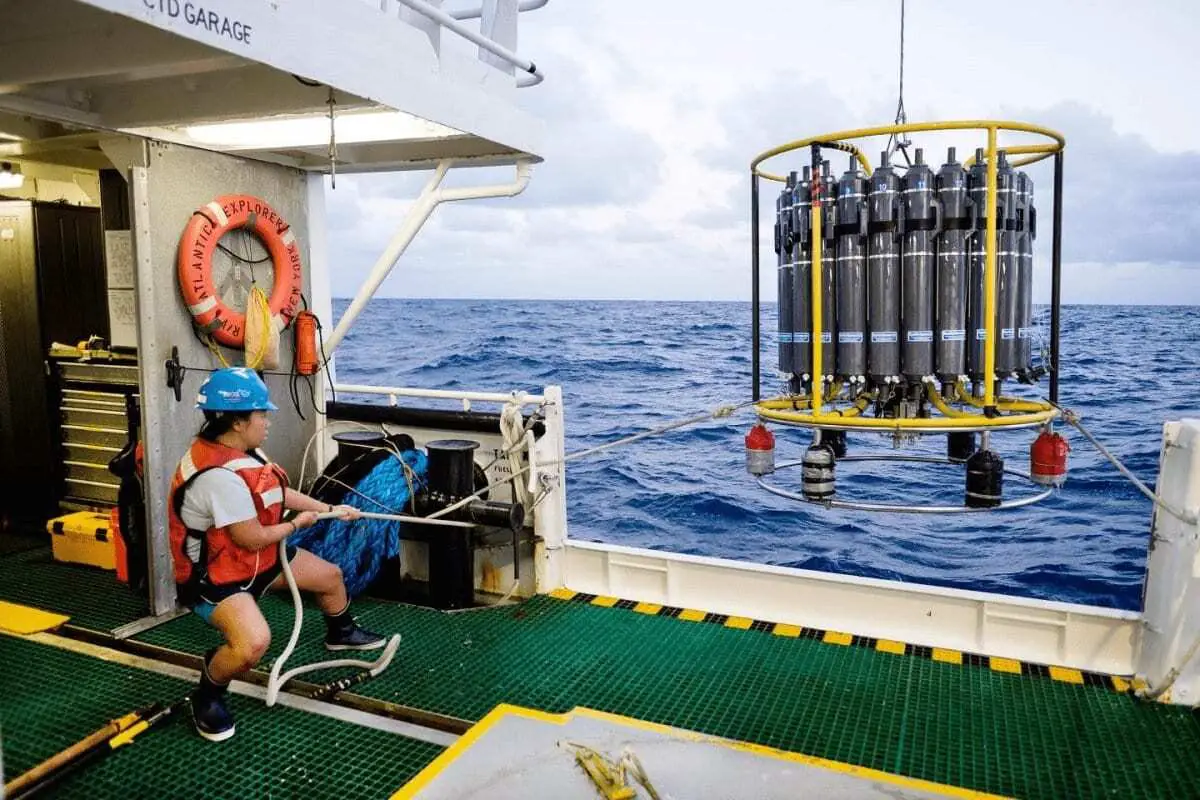 Header Image – Maya Thompson, marine technician intern, hauls in the CTD (conductivity, temperature and depth) rosette aboard the R/V Atlantic Explorer on a recent research cruise in the Sargasso Sea. The CTD rosette collects water samples and physical oceanographic measurements from discrete depths. Credit : Bermuda Institute of Ocean Sciences