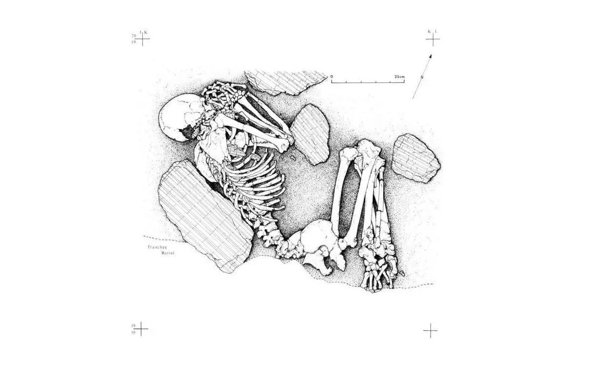 Header Image – The burial of Pendimoun F2 (5480-5360 BC), woman carrying about 55% of hunter-gatherer component. Image Credit : Henri Duday