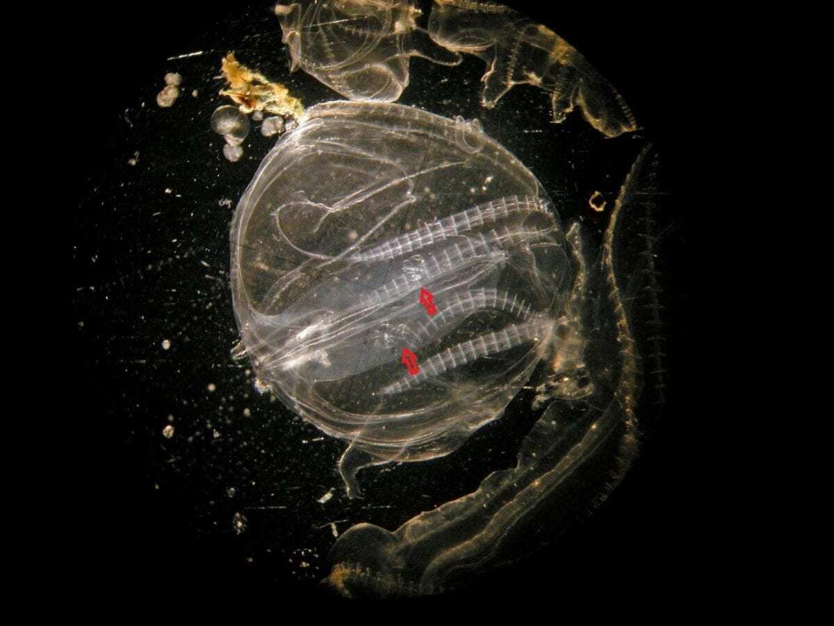 Header Image – Photographic evidence of cannibalistic behavior; Mnemiopsis leidyi larvae (next to red arrows) within the auricles of an adult. Credit : Jamileh Javidpour/University of Southern Denmark