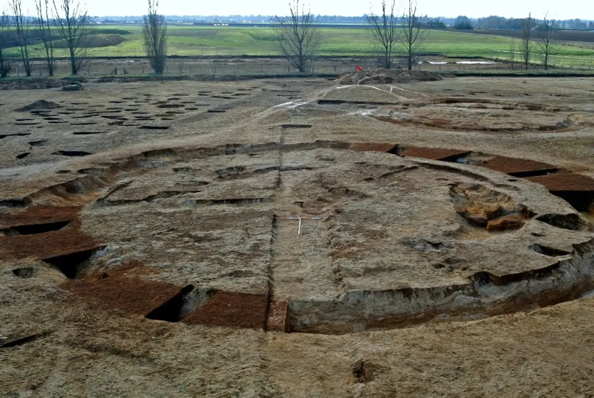 Excavations revealed large, densely concentrated pits, wells, enclosures, and burials within a settlement. Human remains were found in both official graves and non-funerary sites, including disarticulated bones and structured excavations in pits.