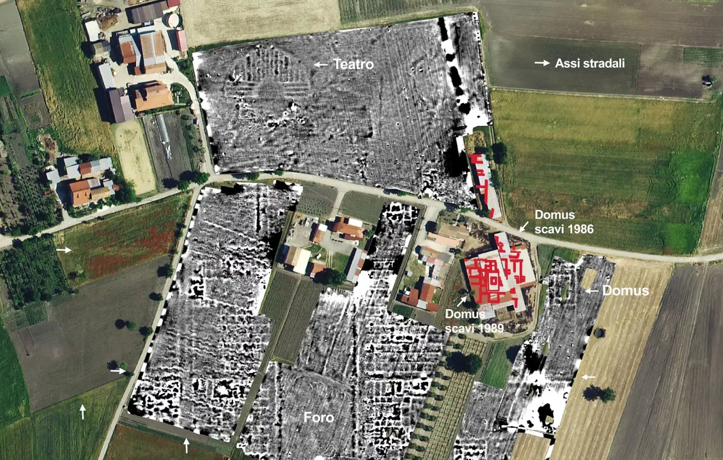 The surveys clearly identified an orthogonal street grid, with regularly spaced axes characteristic of newly founded Roman cities. Most striking is the identification of the forum—the civic and commercial heart of the settlement—featuring a vast central square bordered by public buildings.