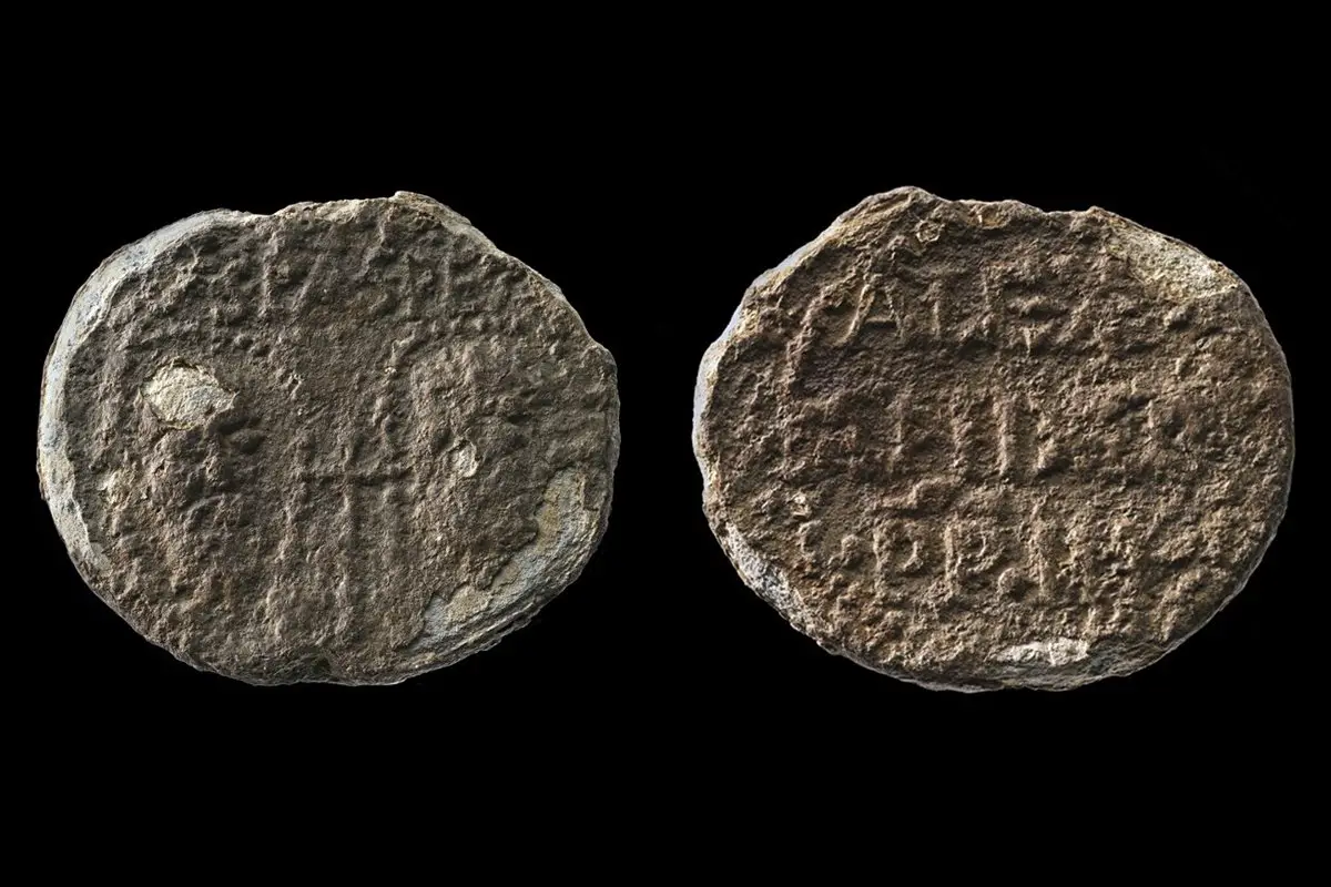 An example of the papal bulla, the object was traditionally used to authenticate official papal documents. The oval lead seal is about four centimetres wide and exhibits obvious heavy corrosion, although its imagery and inscriptions are recognisable.